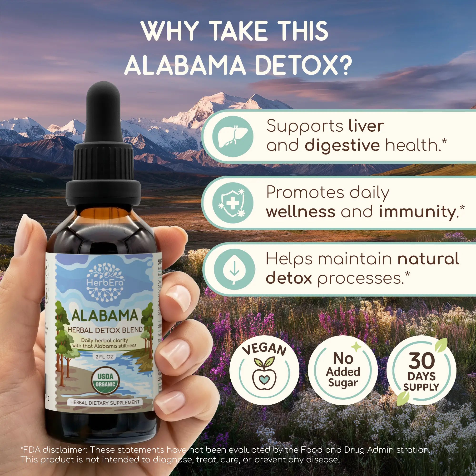 Alabama Detox Blend Tincture is your herbal invitation to the clear rivers and resilient highlands of the Heart of Dixie. This USDA Organic dietary supplement is a gentle wellness formula crafted to support your body’s natural liver detox and renewal processes. It helps promote internal balance, digestive comfort, and steady vitality, empowering you to feel refreshed and resilient every day.