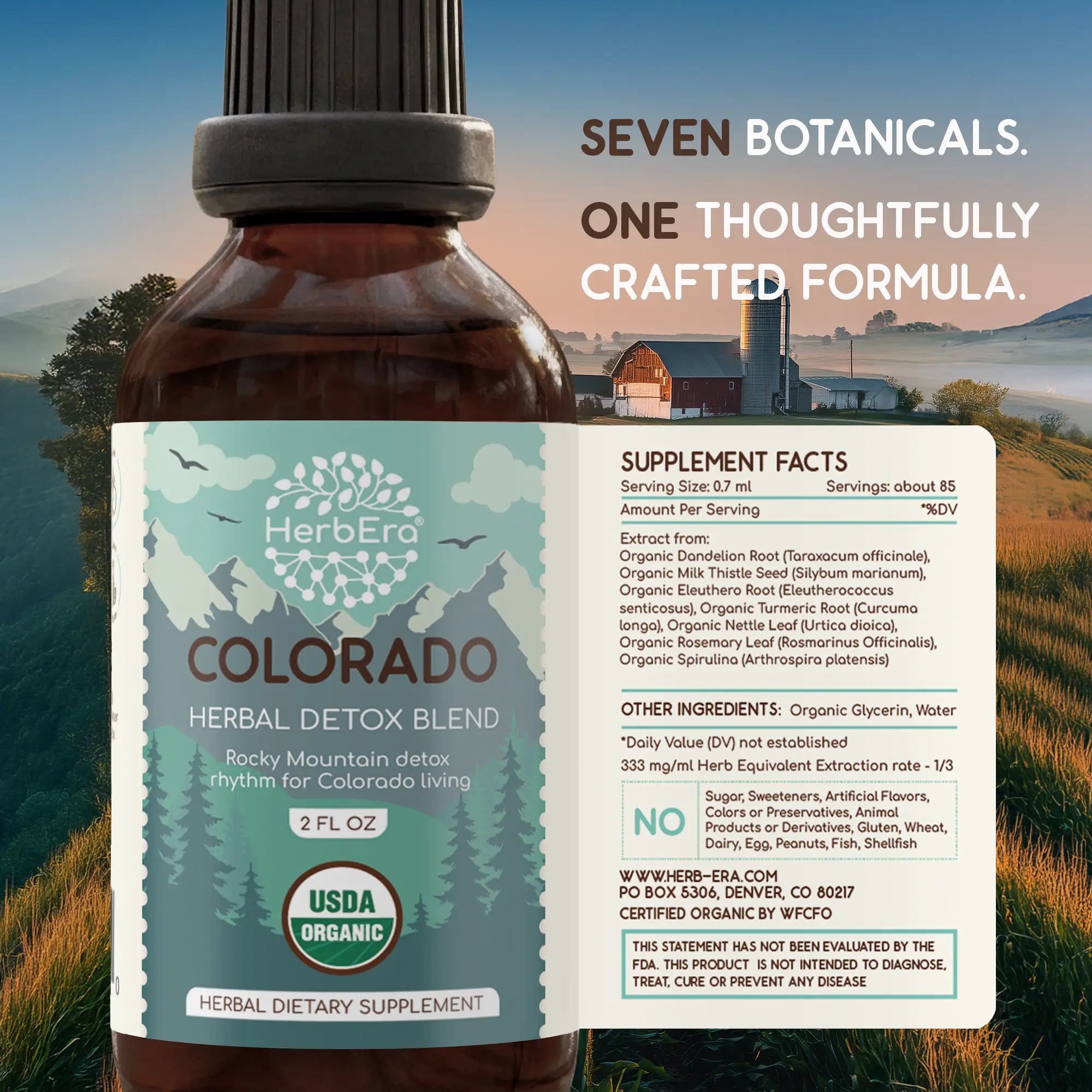 Colorado Detox Blend Tincture is a tribute to the crisp, thin air and soaring summits of the Centennial State. This USDA Organic dietary supplement is a revitalizing wellness formula crafted to support your body’s natural detoxification at a foundational level. It promotes liver health, delivers deep cellular nourishment, and fosters the clear-headed, resilient energy of the high country — helping you achieve a state of vibrant equilibrium.