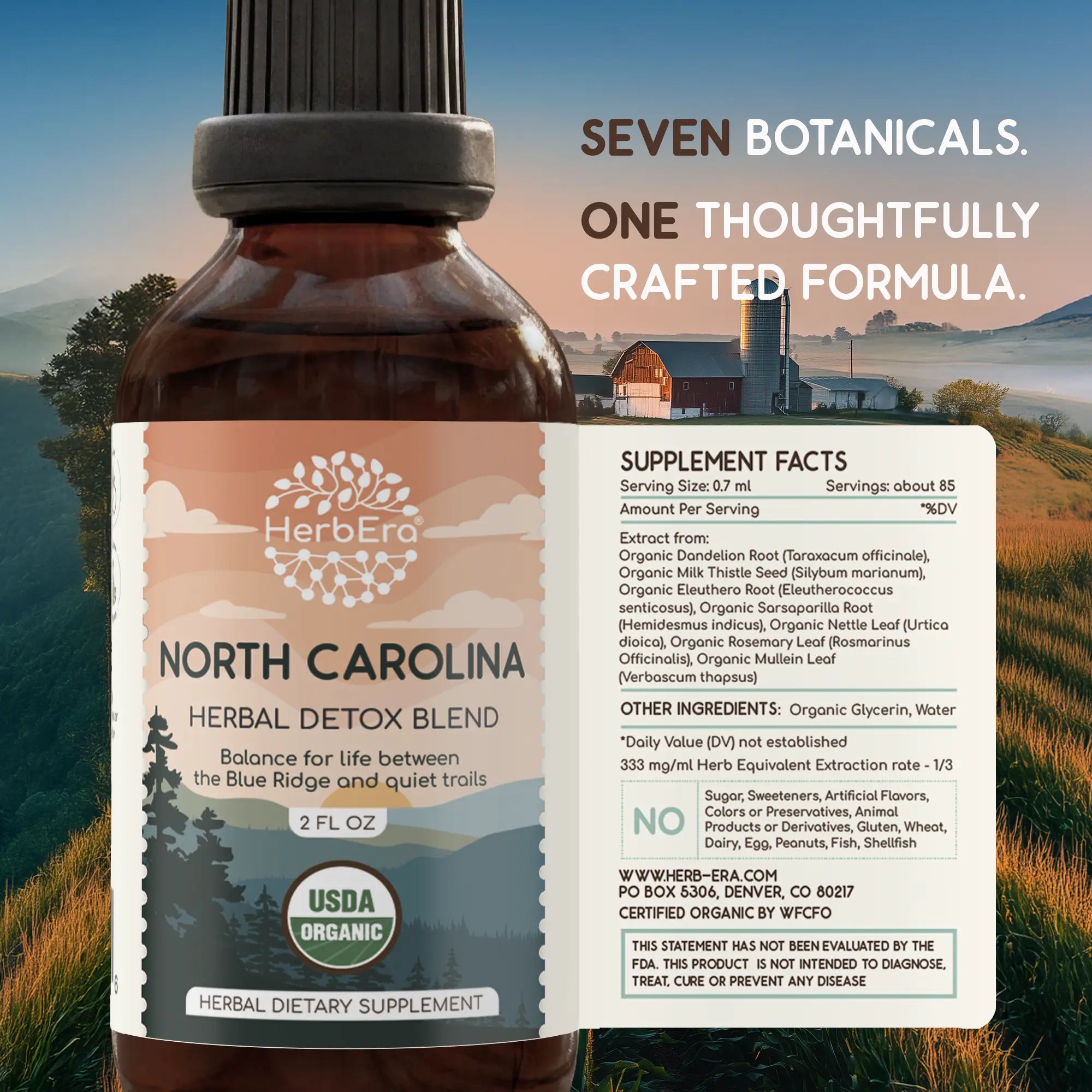 North Carolina Detox Blend Tincture is a celebration of the serene strength found from the Appalachian highlands to the Atlantic coastline. This USDA Organic dietary supplement is a balanced wellness formula crafted to support your body’s natural detoxification and renewal processes. It promotes natural liver cleansing, resilient energy, and deep internal clarity — helping you achieve a state of vitality as refreshing as a mountain mist.