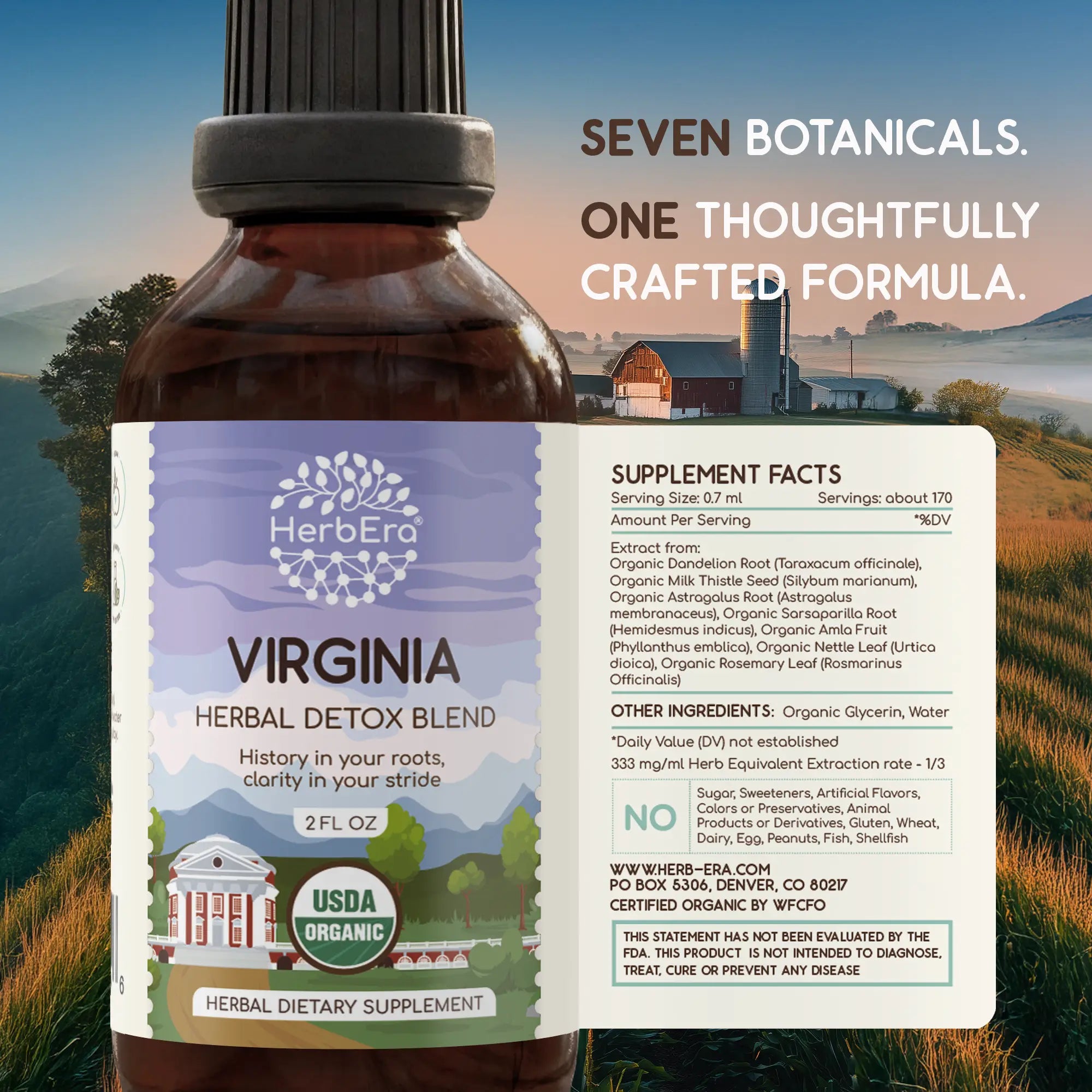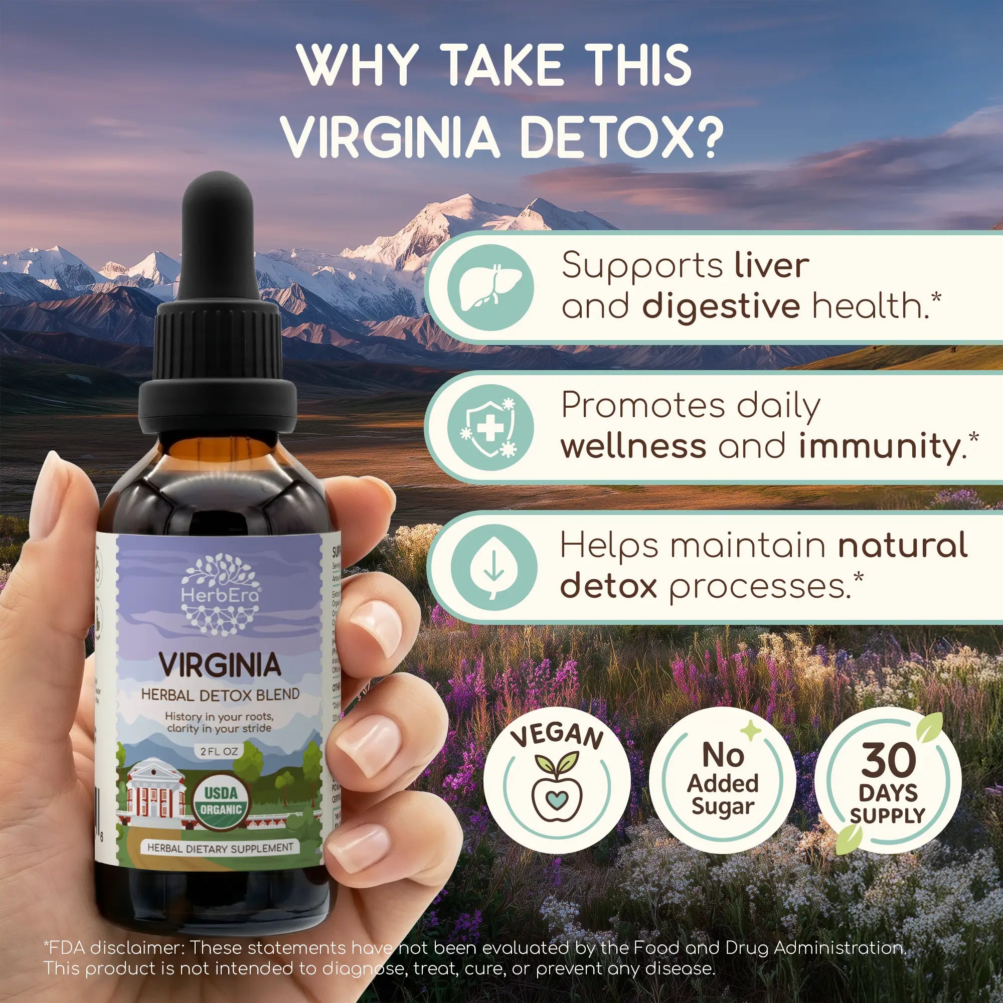Virginia Detox Blend Tincture is a tribute to the gentle strength and purposeful, renewing balance of the Old Dominion. This USDA Organic dietary supplement is a refined wellness formula crafted to support your body’s natural detoxification and resilience. It promotes gentle internal cleansing, immune nourishment, and serene vitality — helping you achieve a state of well-being as enduring as the Blue Ridge and as refreshing as the Chesapeake tide.